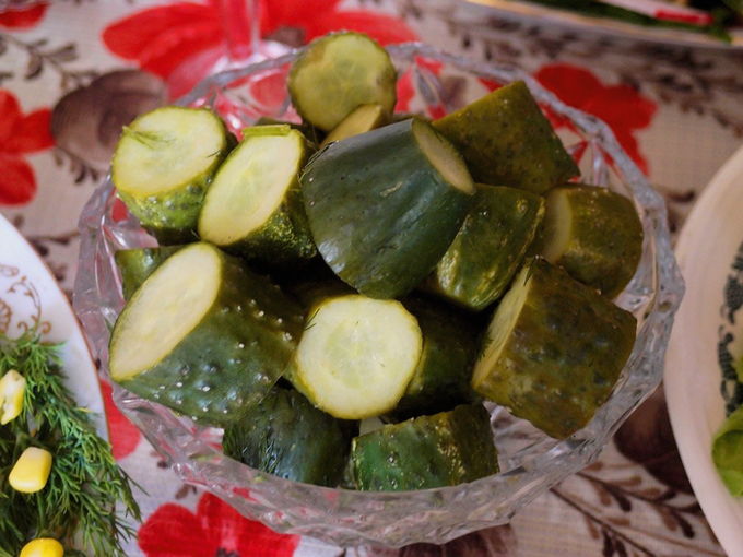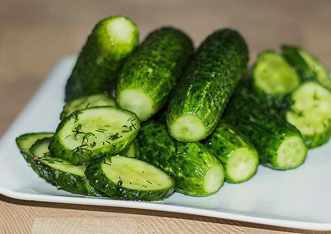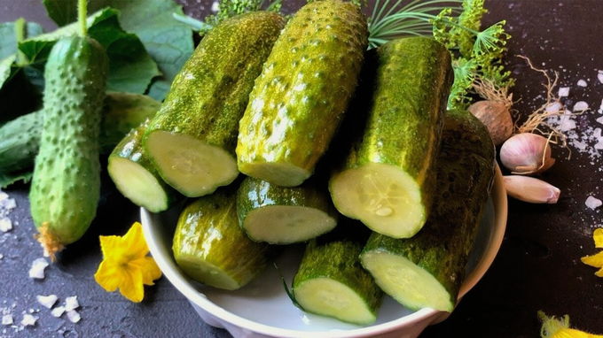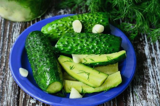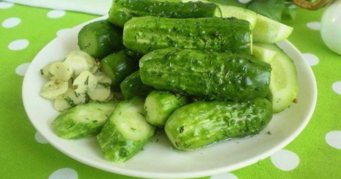 - Serveer kant-en-klare komkommers koud, leg ze op een schaal samen met knoflook en dille uit een zak. Dit voorgerecht diversifieert de tafel perfect en past zelfs goed bij gewone gekookte of gebakken aardappelen.