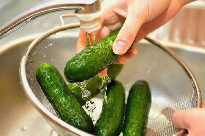 - Neem de meest verse of in ijswater gedrenkte komkommers en was ze grondig van stof en zand onder stromend water.