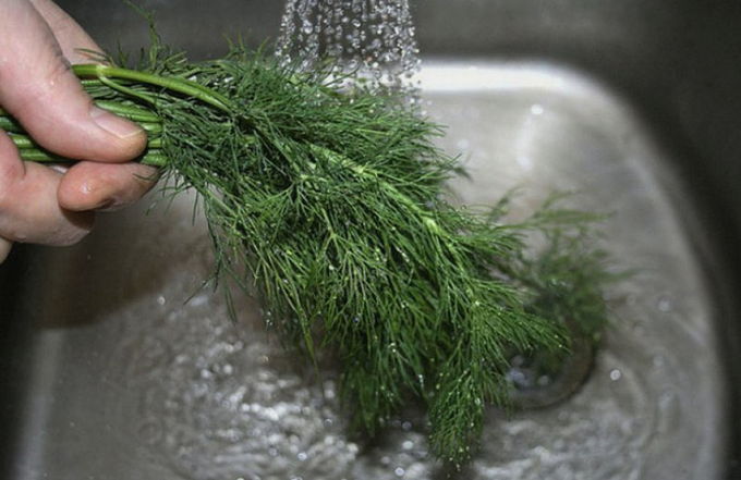- Neem eerst de dille en spoel deze goed af, laat de overtollige vloeistof weglopen.Doe de helft van de dille op de bodem van een pot of pan, deze moet vooraf goed gewassen worden.