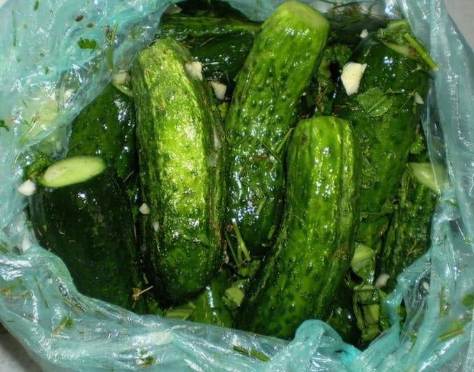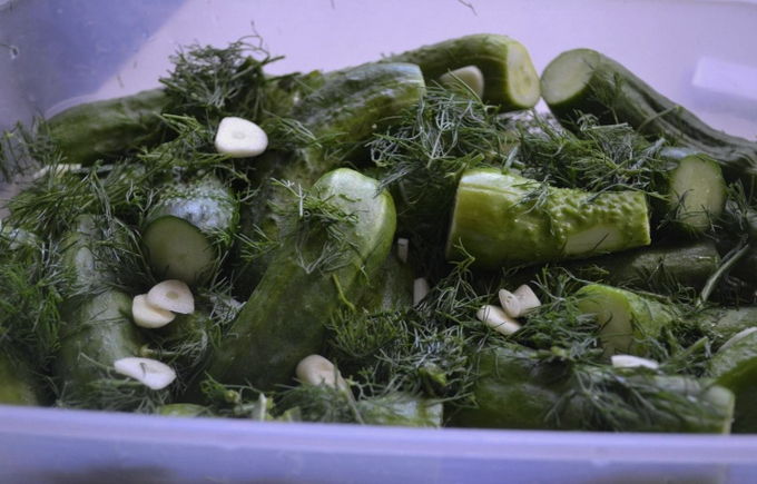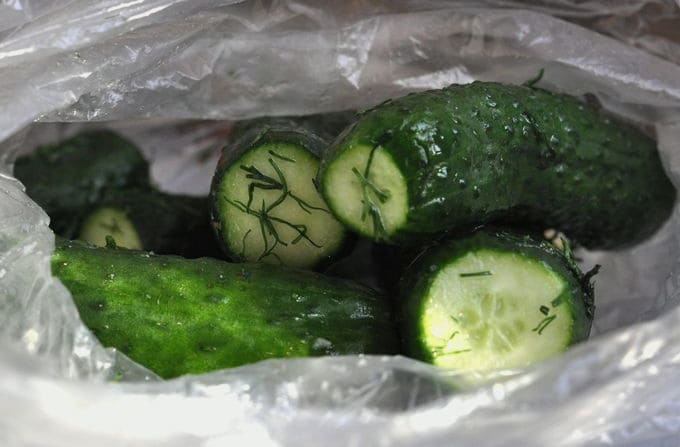 - Plaats de ene dikke plastic zak in de andere om er zeker van te zijn dat er niets lekt. Doe komkommers in deze zakken en gehakte dille en halve knoflook. Voeg op het einde zout, peper en azijn toe. Bind de ingelegde komkommerzakken goed vast en schud en roer de zakken vervolgens een paar minuten heel krachtig. De ingrediënten zijn gelijkmatig verdeeld en gemengd. Je kunt bovendien zakken met komkommers op een bord leggen, waarna je de komkommers in de koelkast moet zetten. Zout de komkommers minstens een paar uur, en als je meer tijd hebt, kun je ze langer in de koelkast bewaren.