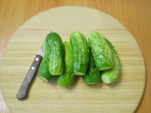 - Spoel de komkommers onder stromend water, snij de peuken af met een mes en plaats de vruchten zelf stevig op een dillekussen.