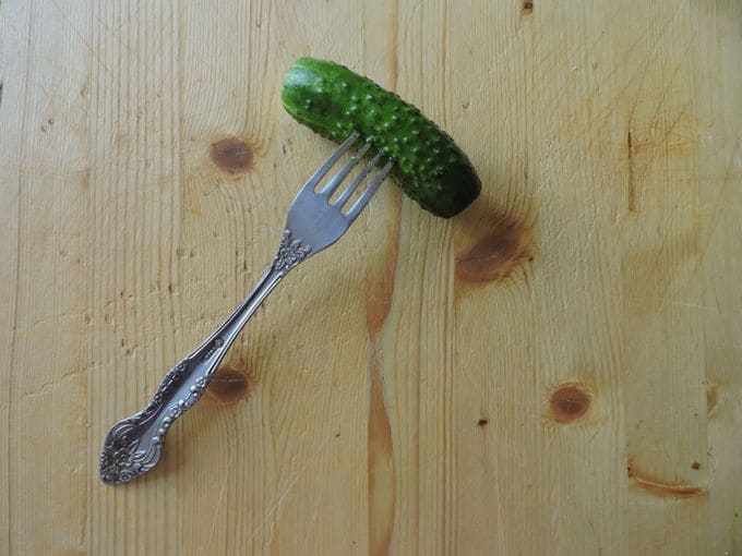 Snijd de peuken van komkommers af en prik de vruchten zelf met een vork zodat ze beter en sneller gezouten zijn.