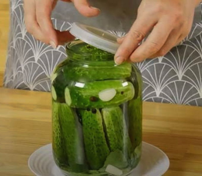 - De container met komkommers moet goed worden gesloten met een deksel en drie dagen op een donkere plaats in een kamer worden bewaard. Drie dagen zijn voldoende om de komkommers klaar te maken.