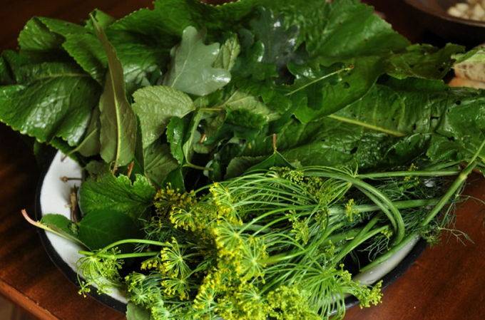 - Druk de komkommers stevig aan op een kussen van bladeren en knoflook en bedek ze met het tweede deel van de kruiden. Bereid vervolgens de augurk van de komkommer voor.