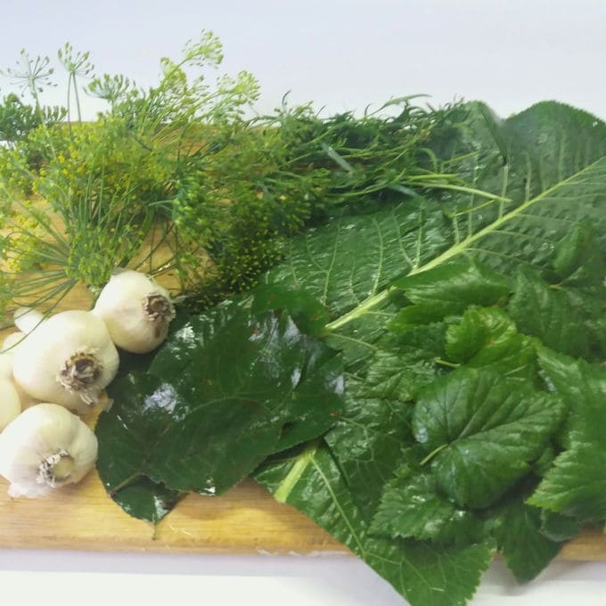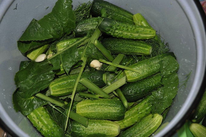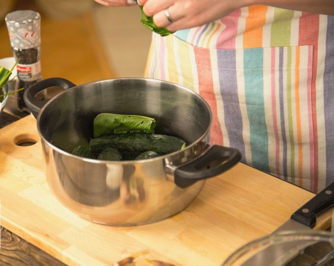 - Neem een grote pan waarin de komkommers vrij liggen zonder tegen elkaar aan te drukken. Was de bladeren die in de pot moeten worden gedaan en schil de knoflook. Leg een laag blaadjes en een paar halve knoflookteentjes op de bodem van de pan en leg de komkommers erop.