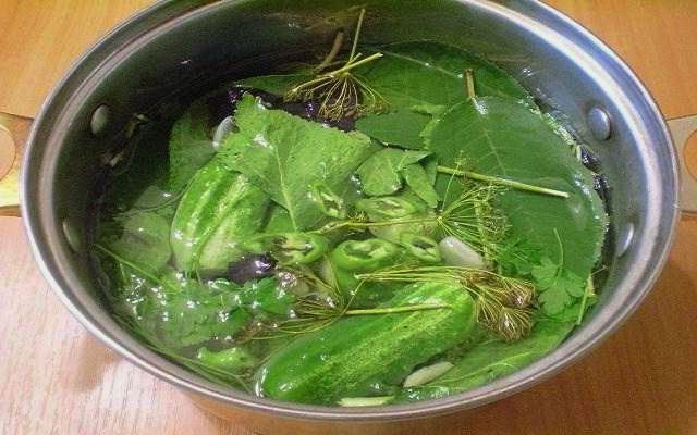 - De pekel moet heet worden gekookt. Breng het pekelwater aan de kook en verdun het zout en de kristalsuiker erin. Doe de komkommers in een schone pot, afgewisseld met kruiden en knoflookteentjes.