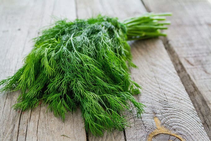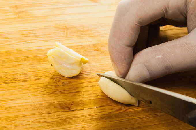 - Pel de knoflook en halveer de teentjes. Spoel de dille onder water en droog licht. Snijd de twijgen vervolgens in kleinere stukjes.