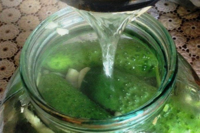 - Giet kokende pekel in een pot komkommers en giet vervolgens azijn in de container. De augurk moet de komkommers volledig bedekken en de hals van de pot bereiken.