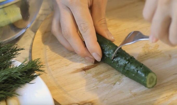 - Een bosje dille moet grondig worden afgespoeld onder stromend water en gedroogd. Dan moet je de dillegroenten fijn hakken met een scherp mes.Snijd de komkommerpeuken af en prik met een vork in het fruit. Deze fase is belangrijk om ervoor te zorgen dat de komkommers de marinade actiever opnemen en ook hun eigen sap laten. Anders kunt u de komkommers eenvoudig in de lengte in vieren snijden.