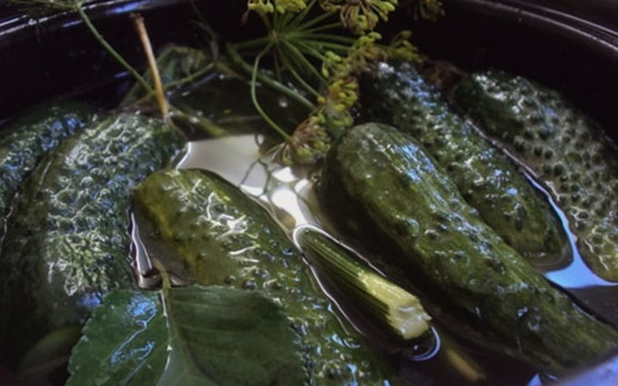 - Bereiding van de pekel: verdun zout en kristalsuiker in schoon drinkwater. Plaats de container met de pekel op het fornuis en breng de oplossing aan de kook. Giet een bak komkommers met kokende pekel helemaal naar boven. Sluit de container met komkommers met een deksel en laat een dag op kamertemperatuur staan, om te beitsen.