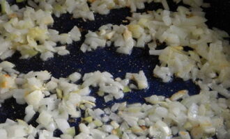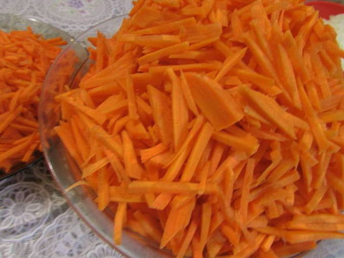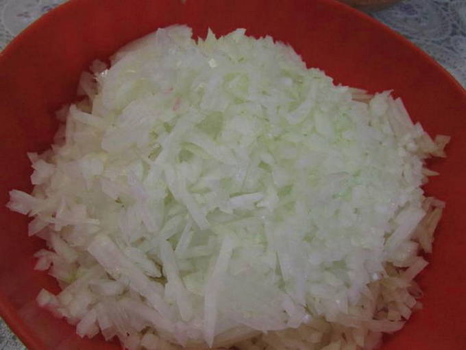 - We bereiden ook uien. Het kan ook met de hand worden geraspt of in dunne stukjes worden gehakt.