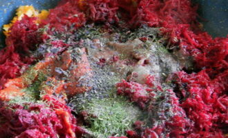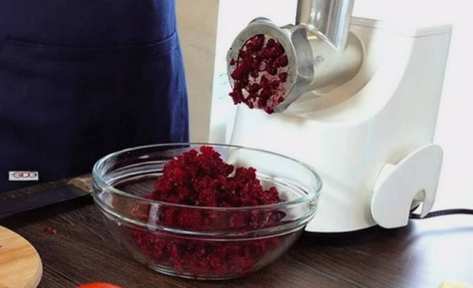 - We halen de bieten door een vleesmolen, voegen mayonaise, zout en peper naar smaak toe.