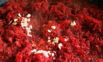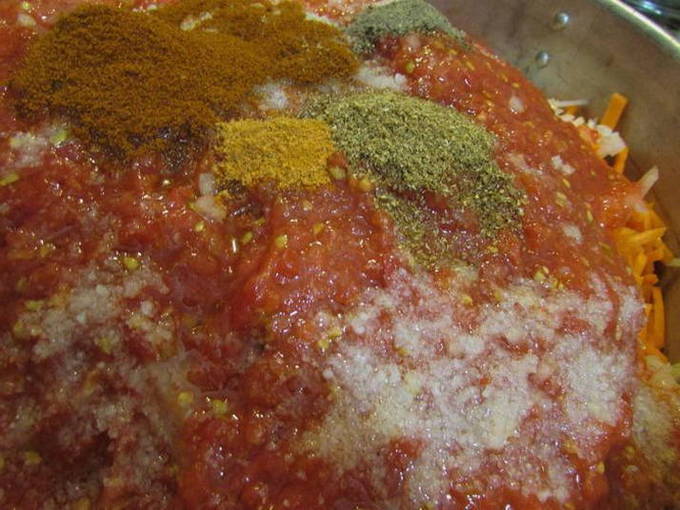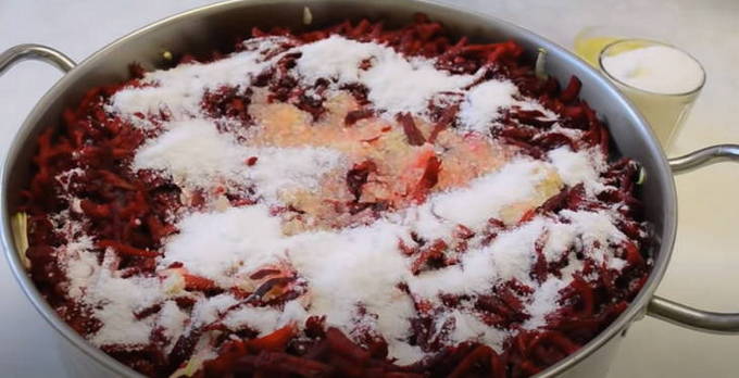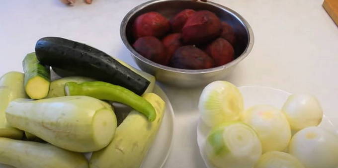 - Snijd de ui in kleine blokjes met een mes, drie bieten en courgette op een grove rasp. Haal de knoflook door een pers. Doe gesnipperde ui, geraspte bieten met courgette, knoflook in een grote kookpan, doe een peul hete peper. Voeg zout, suiker, plantaardige olie, azijn, gemalen piment en water toe. We laten alles twee uur staan om sap te extraheren.