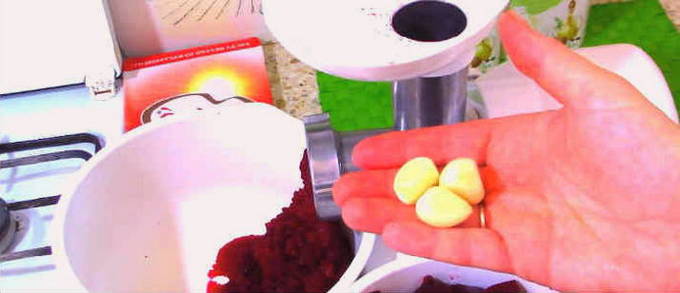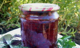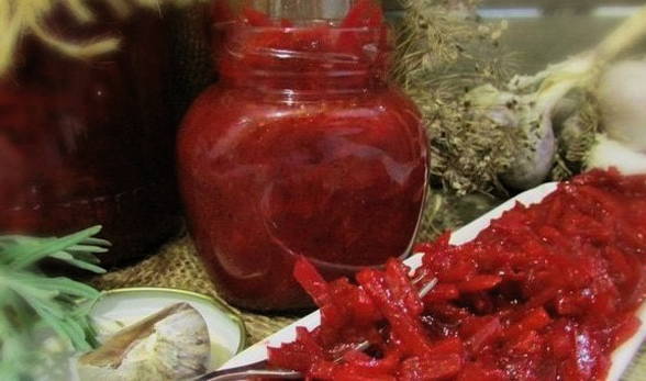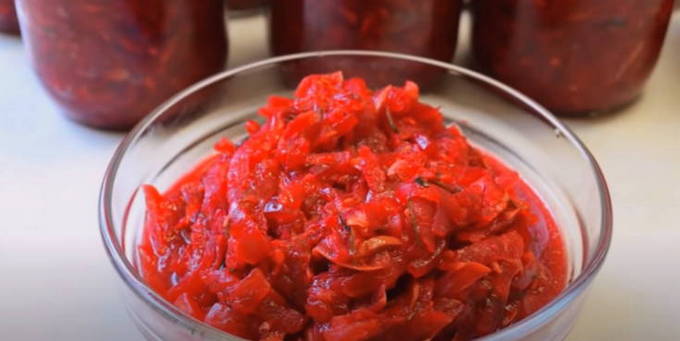 Een zeer smakelijke blank die zal wedijveren met adjika en andere scherpe naden. De zoetheid van bieten wordt goed gecombineerd met knoflook en hete peper. Voor de volledigheid voegen we ook nog paprika en tomaten toe. Een dergelijke kaviaar is een ideale aanvulling op koud vlees, spek en snacks met gevogelte.
