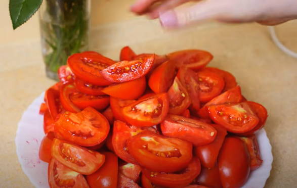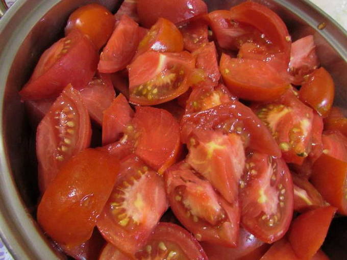 - We wassen de tomaten, drogen ze, snijden het spoor uit de stengel. In stukjes snijden.