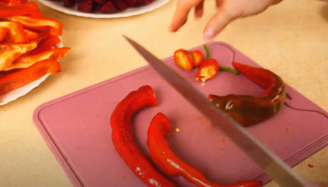 - We bereiden groenten: schil ze, spoel ze af en droog ze af. We wassen alleen hete pepers, we halen de zaden er niet uit.
