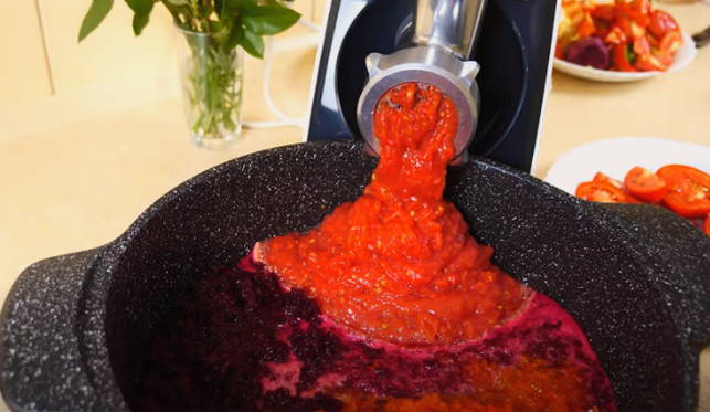 - We wassen en drogen de tomaten. We snijden het spoor uit de stengel, snijden in stukjes, passeren een vleesmolen.
