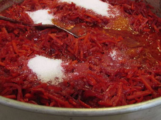 Het recept is heel eenvoudig: bak de uien, bieten en wortelen afwisselend, waarna we de massa op smaak brengen met kruiden, tomatenpuree en in blikjes verpakken. Het braden van de kaviaar is rijk en aromatisch. Het is raadzaam om jonge, zoete bieten te kiezen - met dergelijke bieten zal kaviaar echt "aan je vingers likken".