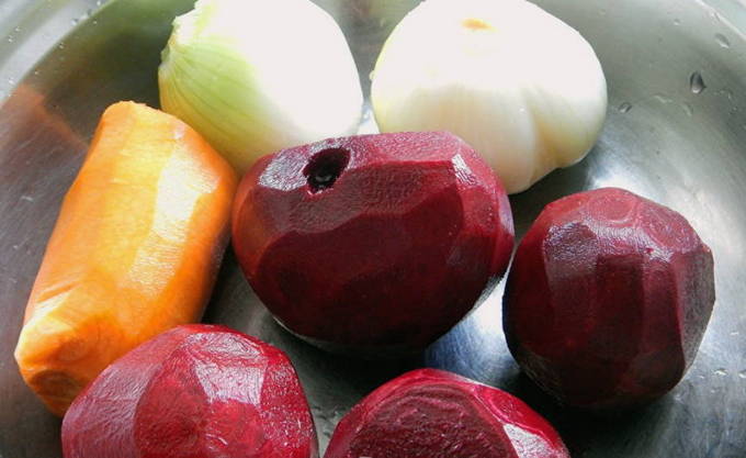 - Kook de bieten gaar. Laat het afkoelen, snij de huid eraf.