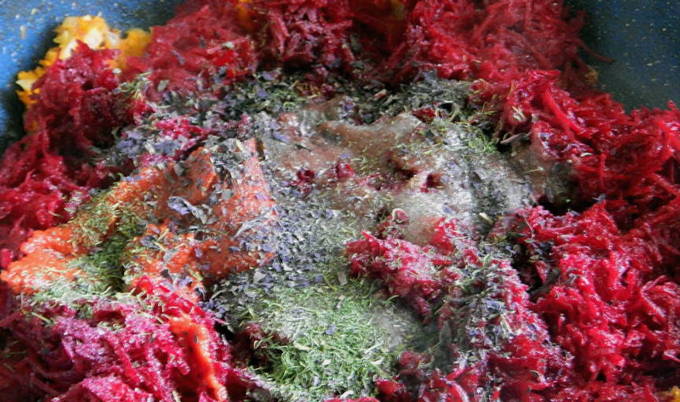 - Snijd de ui in kleine blokjes met een mes, drie bieten en courgette op een grove rasp. Haal de knoflook door een pers. Doe gesnipperde ui, geraspte bieten met courgette, knoflook in een grote kookpan, doe een peul hete peper. Voeg zout, suiker, plantaardige olie, azijn, gemalen piment en water toe. We laten alles twee uur staan om sap te extraheren.