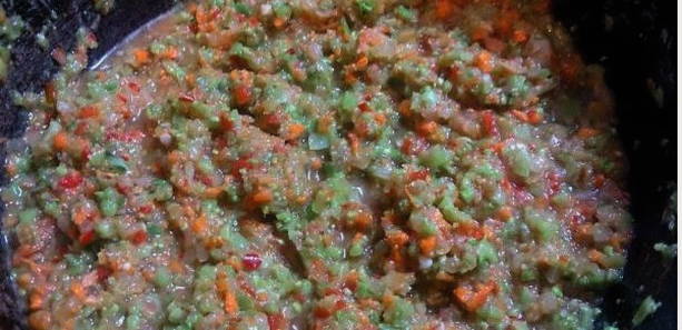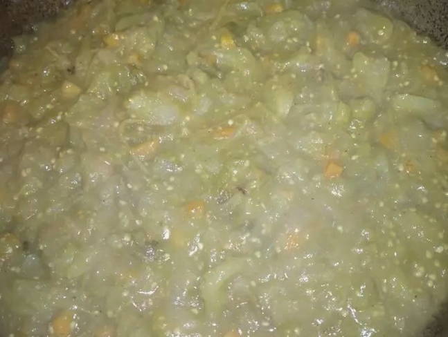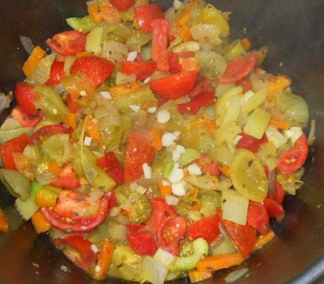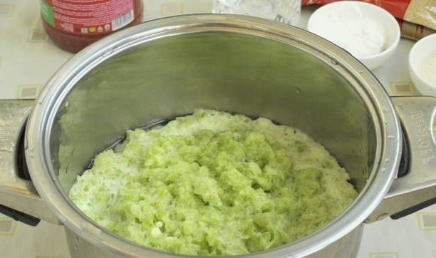 - We halen groenten door een vleesmolen en voegen toe aan de tomaten in een pan.