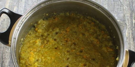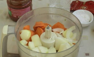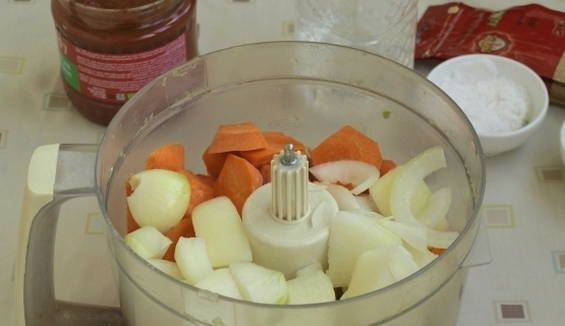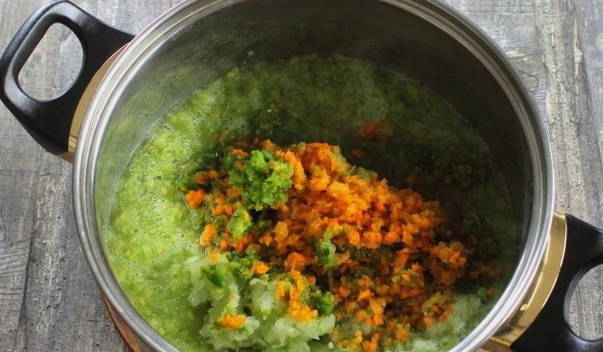 - Maal alle groenten met een vleesmolen en breng ze vervolgens over in een pan.