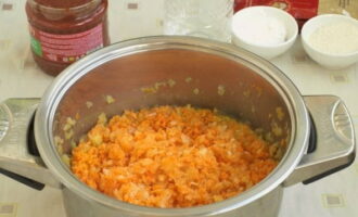 - Giet olie in een pan, voeg tomatenpuree, suiker en zout toe. Meng alles opnieuw en laat ongeveer 15 minuten onder het deksel sudderen.