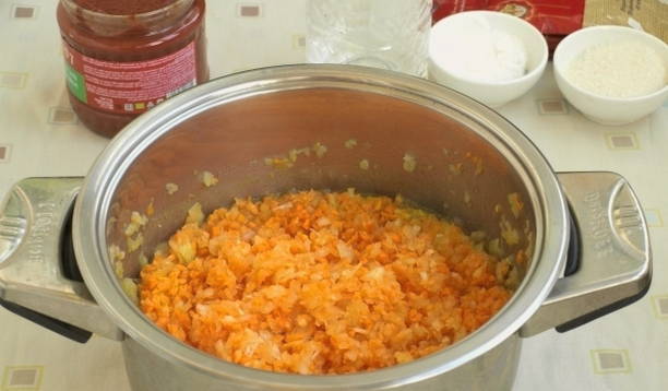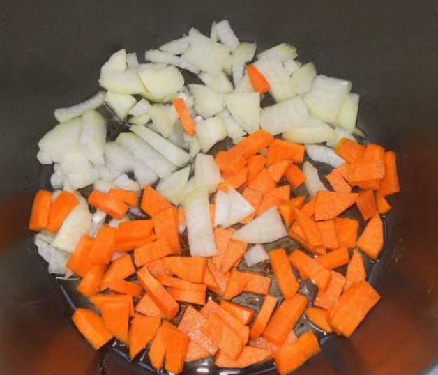 - Giet de olie in de kom van de multikoker, doe de wortels en uien, in stukjes gesneden, erin. We stellen de modus "Bakken" in op 40-45 minuten.