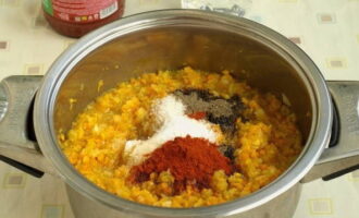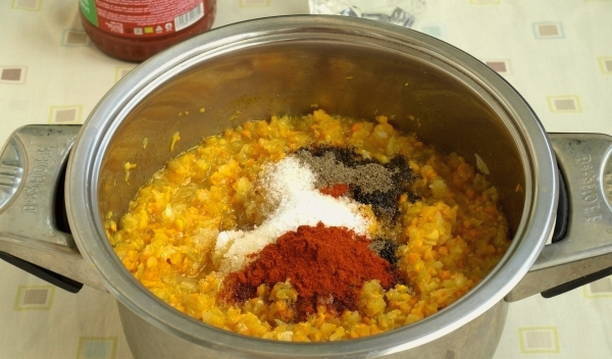 - Voeg dan naar smaak peper, zout, suiker en andere kruiden toe. We blijven de kaviaar bakken, af en toe roeren, tot ze zacht zijn.