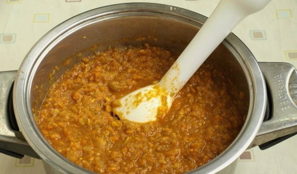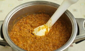 - Maal de groenten met een staafmixer tot puree, voeg azijn toe en selecteer opnieuw de modus "Bakken" voor nog eens 10 minuten.