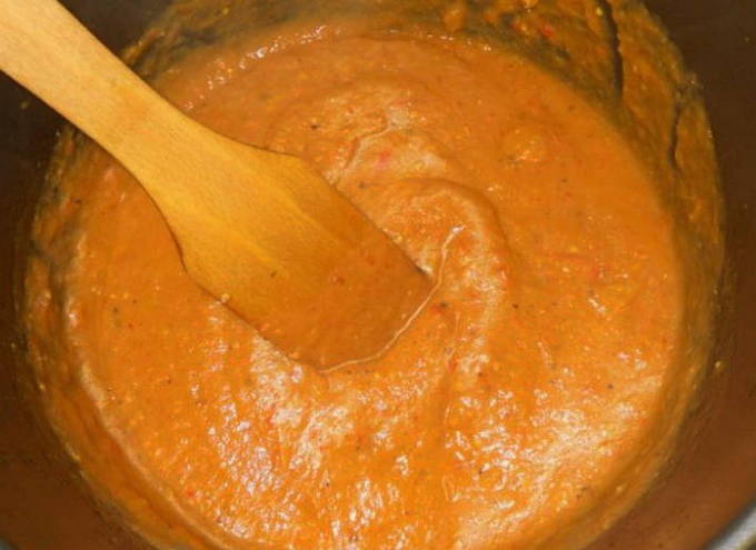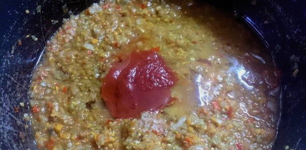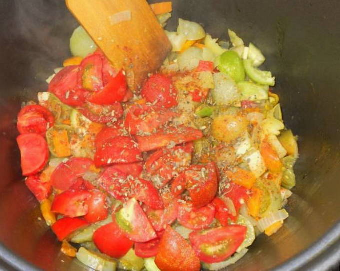 - Voeg rode tomaten, zout, suiker en kruiden toe met de peper. Roer en kook nog 20 minuten.