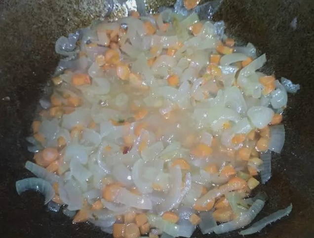 - Voeg fijngehakte wortelen toe aan de ui en bak nog 7 minuten.