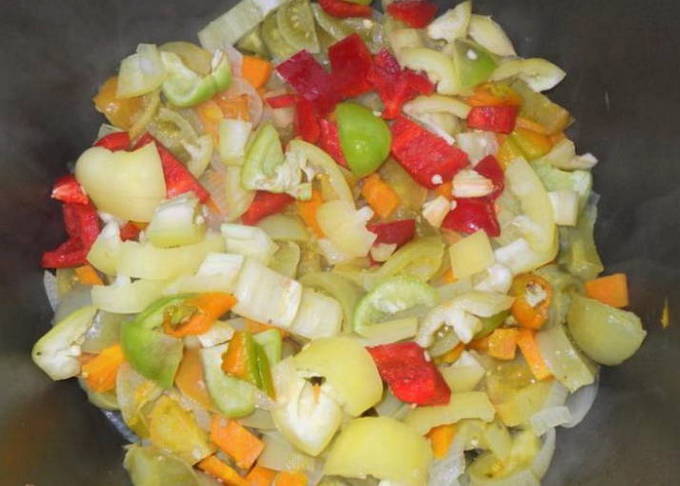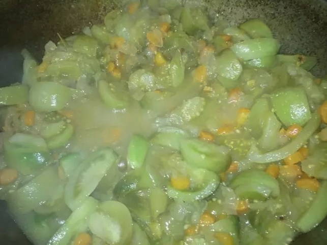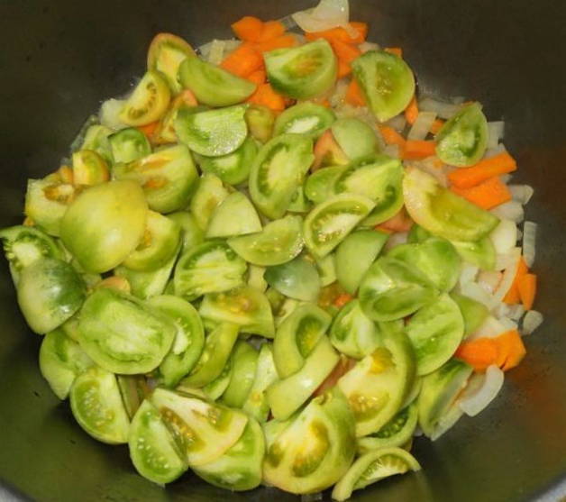 - Voeg na 10 minuten de groene tomaten toe en roer de groenten om.