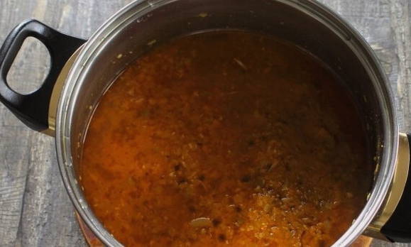 - Voeg olie toe, meng alles goed en zet de pan op het vuur. Breng het mengsel aan de kook en laat het onder een deksel op laag vuur 40 minuten sudderen, af en toe roeren.