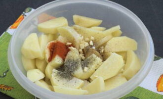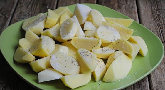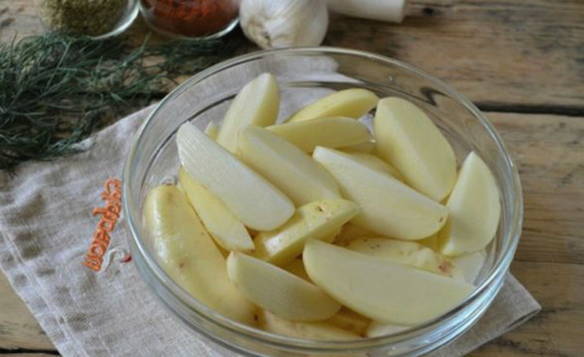 - Aardappels schillen, wassen en in partjes snijden. Combineer aardappelen met een beetje zonnebloemolie, zout en kruiden.