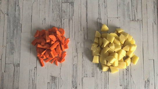 - Schil, was en snijd de groenten in blokjes.