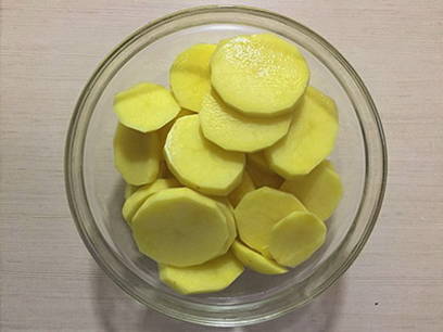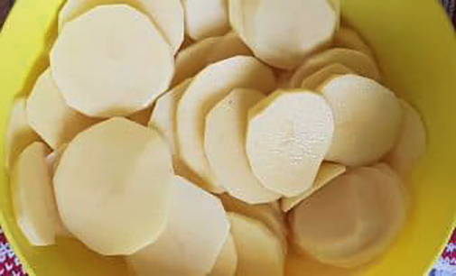 - Snijd de aardappelen in dunne plakjes.
