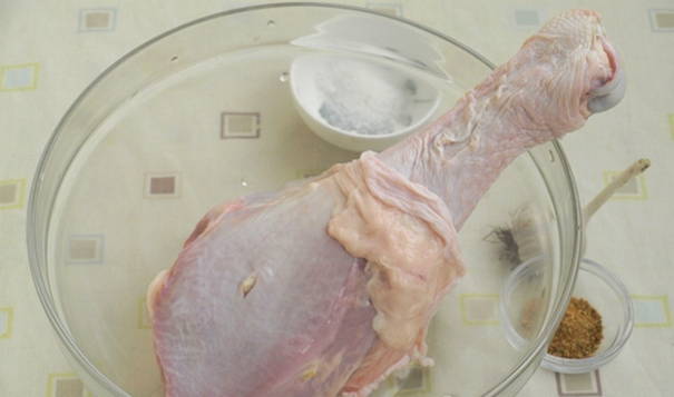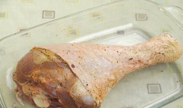 - Was de kalkoendrumstick, veeg hem af met keukenpapier, verwijder het vel, maak diepe sneden in het vlees en leg de knoflookteentjes erin.