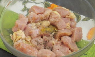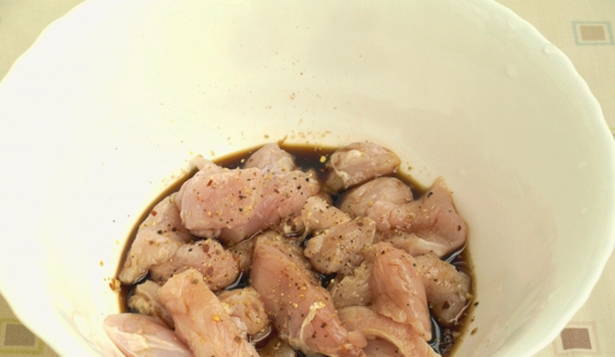 - Snijd de kalkoenfilet in blokjes, doe in een kom, voeg sojasaus, gemalen peper toe, roer om en laat een half uur marineren.