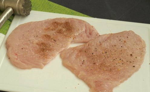 - Snijd de kalkoenfilet in plakjes, klop af, bestrijk met zout en kruiden.