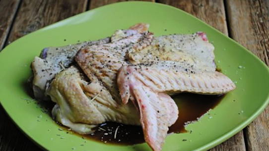 - Was de kalkoen, dep met keukenpapier en snijd het karkas in stukken.