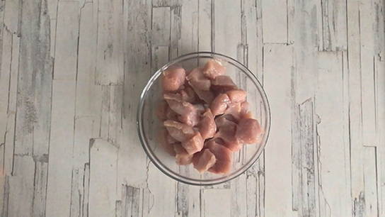 - Was de kalkoenfilet, dep droog met keukenpapier en snijd in middelgrote blokjes.
