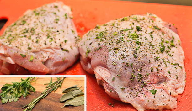 - Hak de salie, rozemarijn en peterselie fijn, bestrijk het vlees met kruiden. Bestrooi de kalkoen met zout en kruiden.