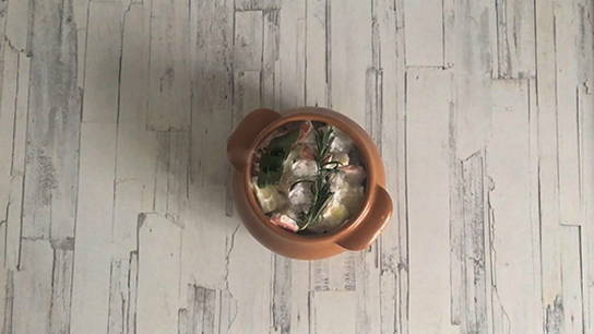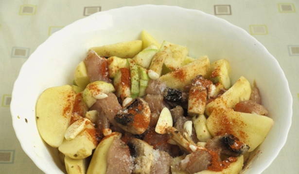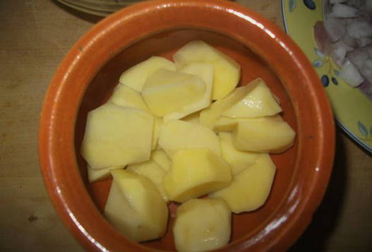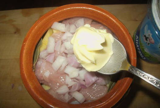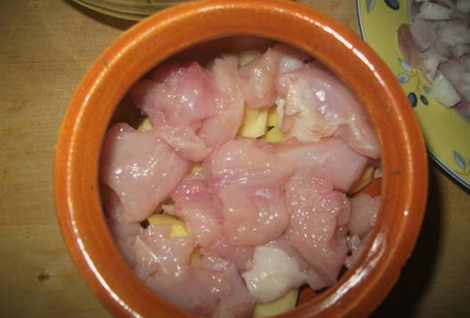 - Neem een aarden pot of een andere ovenvaste schaal. Leg de aardappelen in de eerste laag, dan de kalkoen en uien.