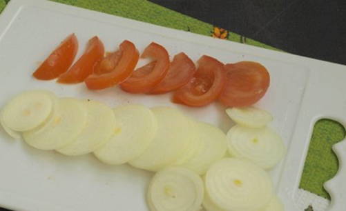 - Snijd de tomaten en uien in plakjes.