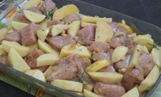 - Doe het vlees in de braadslee en leg de aardappelen erop. Voeg ook de gepelde knoflookteentjes toe.