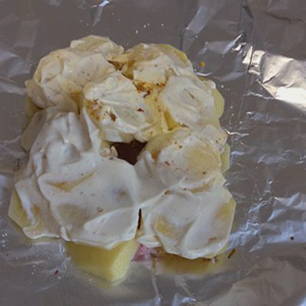 - Schil de aardappelen, was en snij in plakjes. Leg op elk stuk filet aardappelpartjes, zout ze en bestrijk ze met mayonaise.