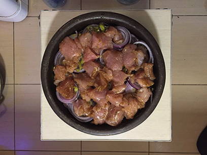 - Zout het vlees, breng op smaak, voeg sojasaus en mosterd toe, roer en laat een half uur marineren.