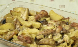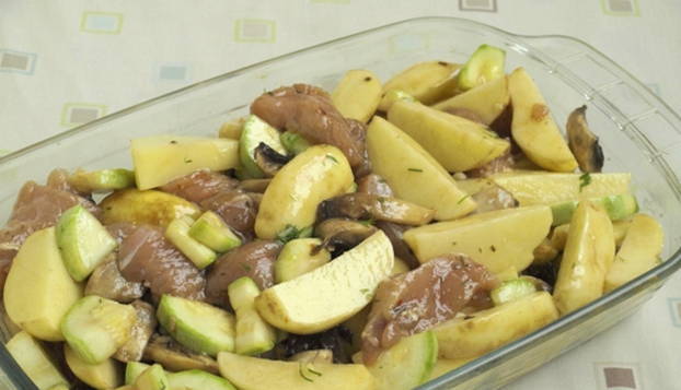 - Snijd de kalkoenfilet in blokjes. Doe aardappelen, uien, paprika's en vlees in een vorm. Breng elke laag op smaak met zout en breng op smaak. Zet de schaal 35-50 minuten in een voorverwarmde oven op 200 graden.