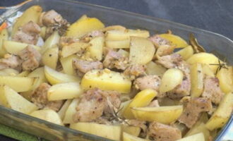- Snijd terwijl het vlees in de oven staat de aardappelen, hak de ui en knoflook fijn. Combineer groenten in een kom, voeg zonnebloemolie, zout en kruiden toe. Haal het vlees uit de oven, draai het om naar de andere kant en leg de groenten erop.